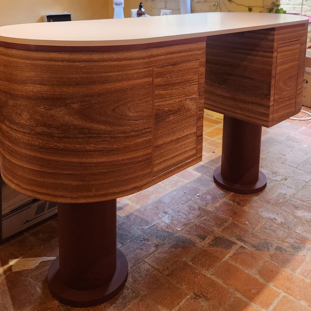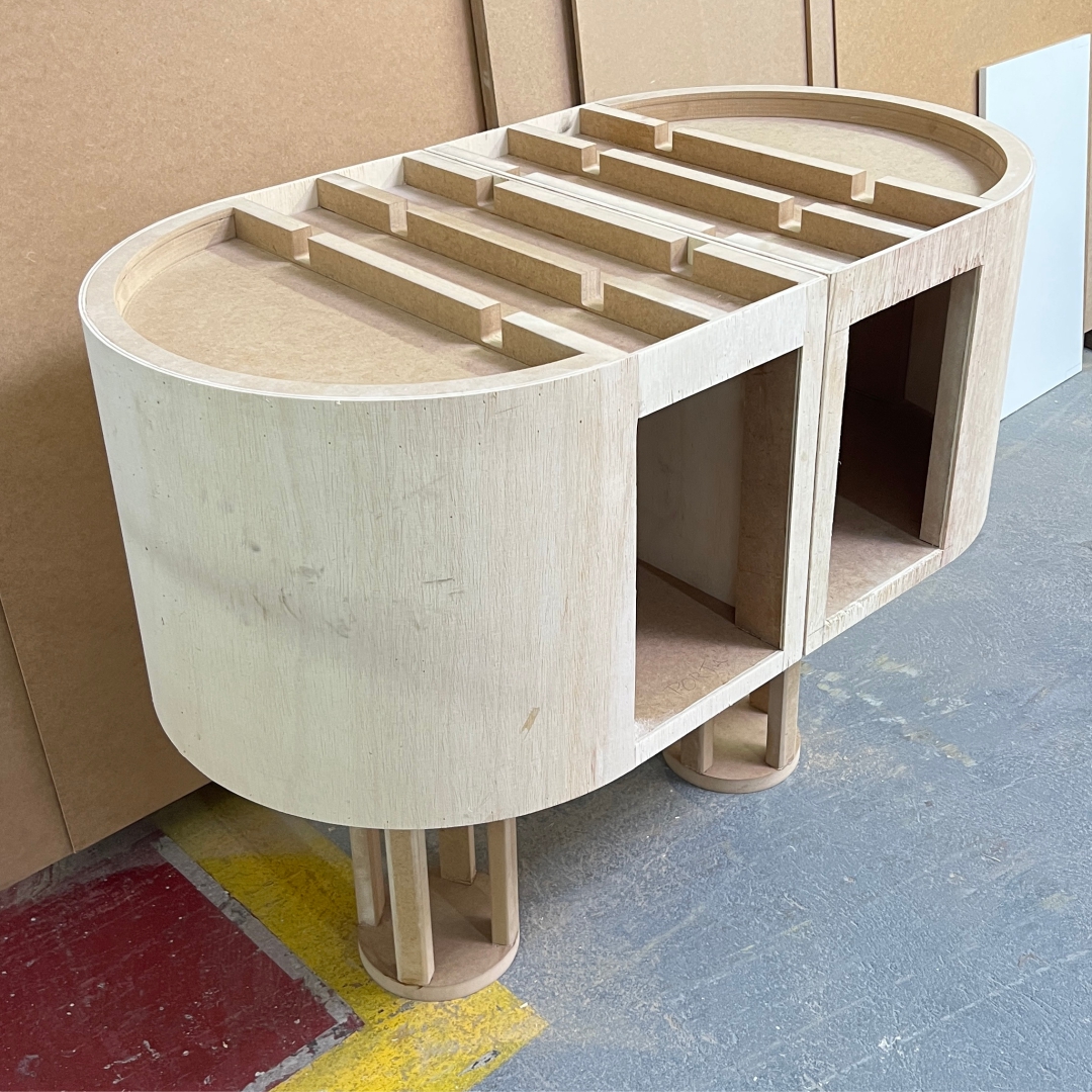Corpo: Utilizou-se de compensado flexível e MDF revestido com folha de madeira natural, buscando um visual sofisticado. O acabamento foi feito com seladora e uma camada superior de cera de carnaúba, conferindo um toque acetinado e aveludado, fundamental para a experiência tátil da cliente.